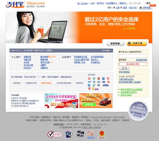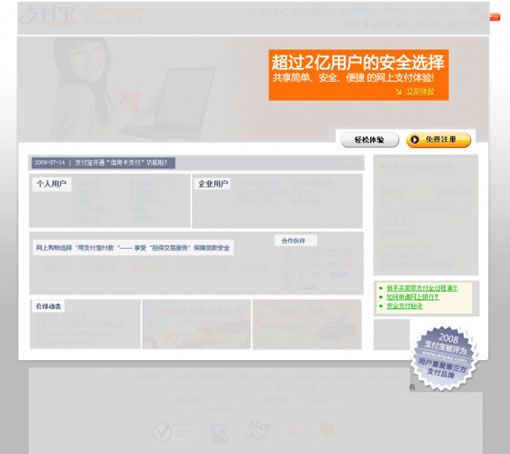 支付寶:大banner分為2塊,左邊是代表著用戶的大美女,右邊是體現實力的宣言“超過2億用戶的安全選擇”,輔助小字為:共享簡單、安全、快捷的網上支付體驗,具有親合力的美女,醒目的大標語,傳達給用戶的信息,支付寶的內容構思很明顯比財付通更直接有效。