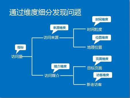 什么是細分呢?細分是在流量分析時最常用的方法。通常也是最有效的方法。細分是指通過不同維度對指標進行分割。查看同一個指標在不同維度下的表現。進而找出有問題的那部分指標。對這部分指標進行優化。這是一個流量細分的示意圖。指標是訪問量,就是我們常說的流量。通過在來源維度,媒介維度,時間維度,位置維度等維度下我們可以對訪問量進行單獨或者重疊的多維度細分。