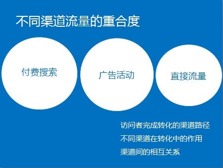 還記得前面的象限圖嗎,那里我們留下了一個問題,第三象限質較低的流量如何處理,是否可以直接砍掉。答案是不能。為什么呢?因為訪問者在整個的購買過程中會穿梭于多個不同的流量渠道中,他們使用不同的工具對信息和商品進行查詢,對比并作出決策。并且越是價值高的商品,訪問者需求的信息越多,決策時間越長。而每個渠道在訪問者的轉化的過程中也會扮演不一樣的角色。有些渠道吸引注意,樹立品牌形象。例如門戶的banner廣告,有些提供精準信息,例如搜索引擎廣告。而有些幫助訪問者進行決策,比如比價和評論。因此,我們在處理前面的問題時,對于質比較差的第三象限流量渠道需要分析這個渠道與其他渠道間的關系,也就是渠道間的重合度。以及這個渠道在整個轉化過程中扮演的角色。這里我們可以看到,廣告活動,付費搜索和直接流量間有明顯的重合。直接砍掉廣告活動流量,或者降低廣告投放都有可能會影響另外兩個渠道的表現。