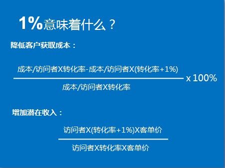 現在讓我們再來看一下1%對于網站來說到底意味著什么?轉化率的提高意味著購買流量的錢變的更有效,每個客戶的獲取成本更低。同時,新增的客戶產生了更多的訂單,進而創造了更多的收入。并且轉化率提升1%對于網站來說是一個長期的,穩定的,并且可以不斷累加的效果。