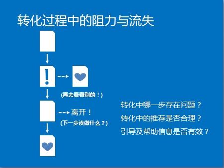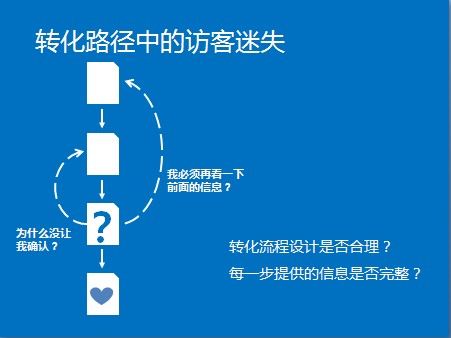 最后,我們來看下轉化分析。轉化渠道與前面的頁面導航很像,區別在于轉化渠道通常是一個目標非常明確的封閉渠道。在這個渠道中我們希望訪問者一路向前,不要回頭也不要離開,直到完成轉化目標。對于轉化渠道,我們主要進行兩部分的分析,分別是訪問者的流失和迷失。下面先來看第一部分:轉化過程中的阻力的流失。轉化的阻力是造成訪問者流失的主要原因之一。這里的阻力包括錯誤的設計和錯誤的引導。
